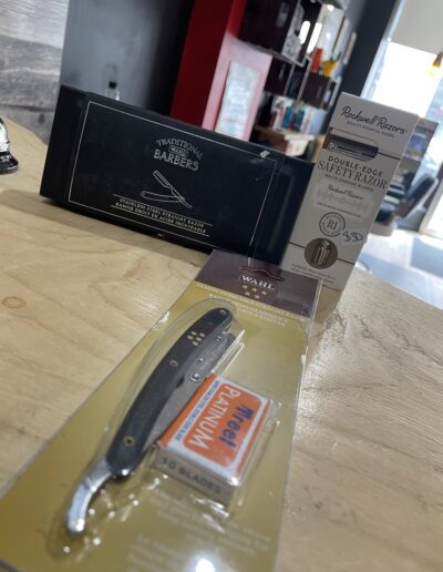 Starting off with several hot towels and our steamer for the ultimate relaxation for 45 minutes, we then use high-end Crown shaving products along with our feather straight razors for a close, clean shave. We finish every shave with after-shave and balm to prevent irritation and ingrown hairs.